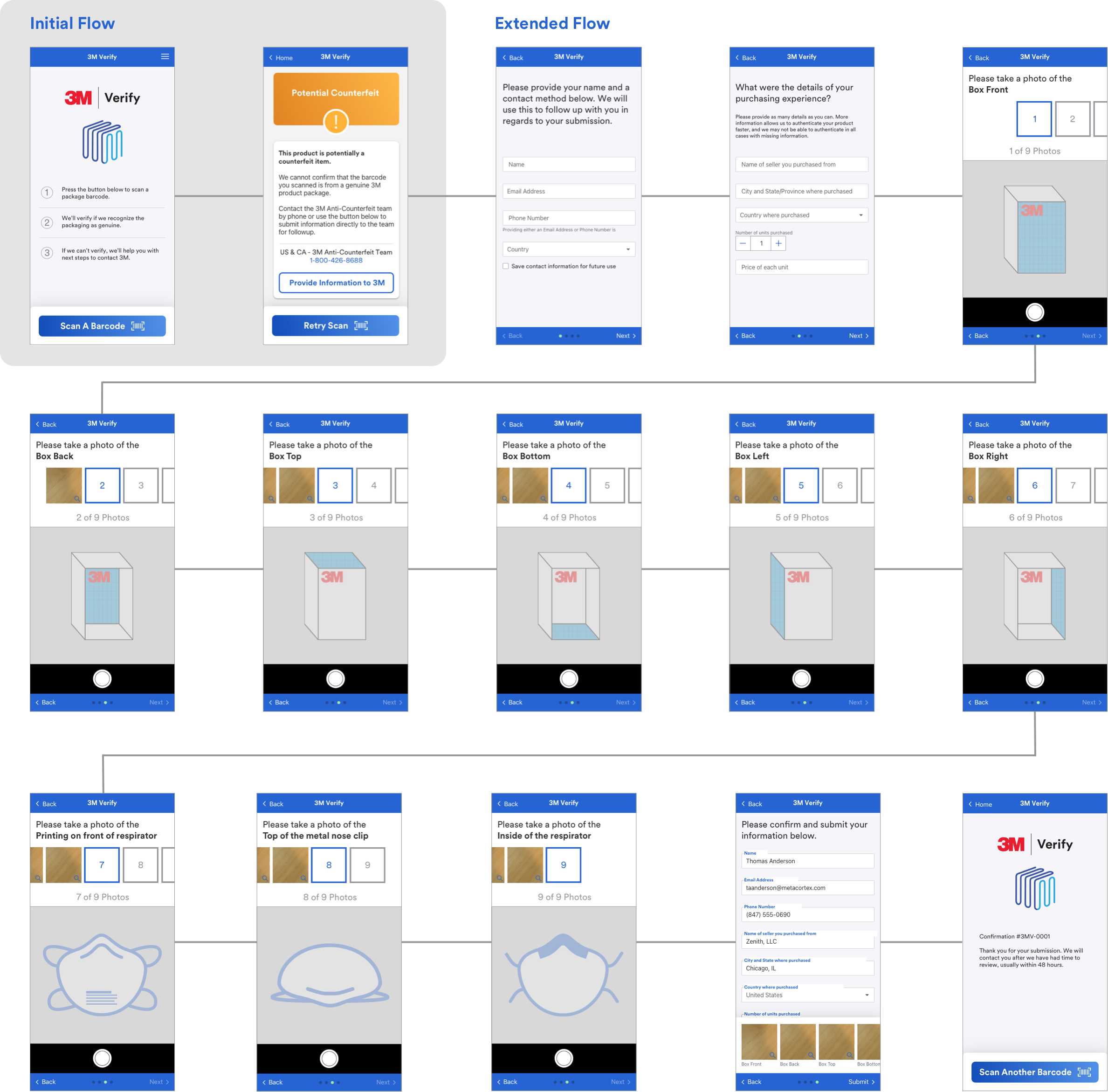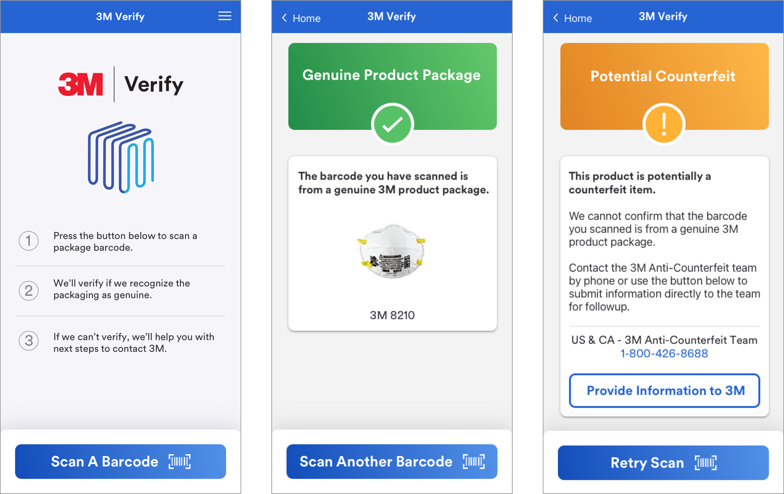 After 3M saw an increase in fake respirators, they invested in a new counterfeit prevention technology. This technology included a preexisting app that allowed users to scan a product barcode and receive a “Genuine Product” or “Potential Counterfeit” result. Stakeholders asked my team to take an existing customer-facing app and “make it look like 3M”.